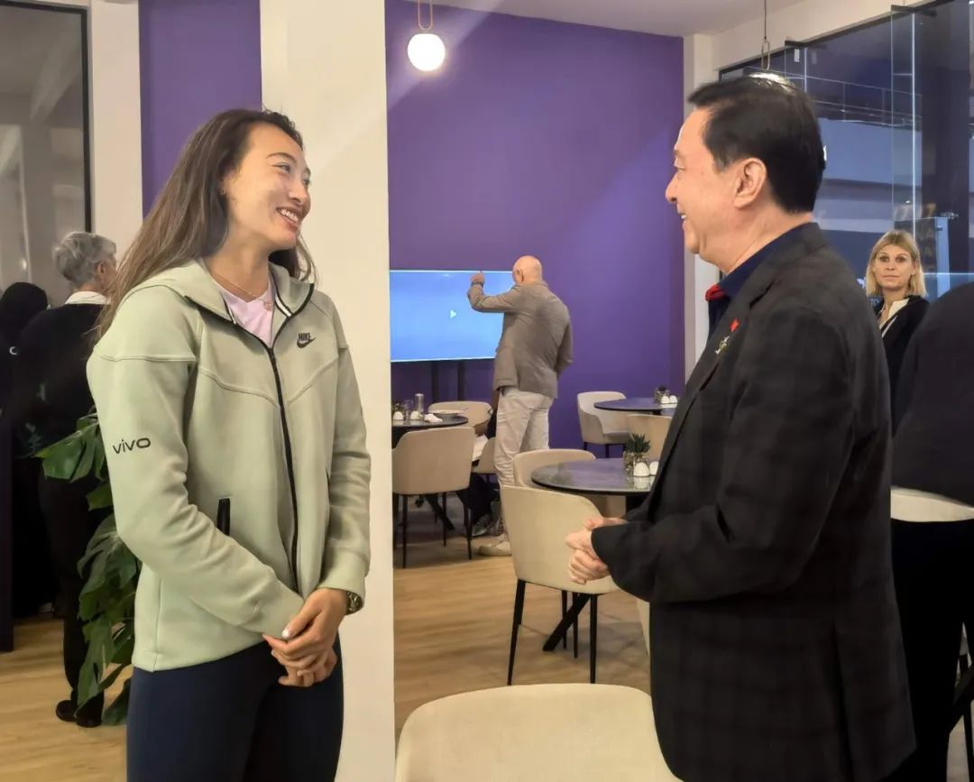 2024年11月2日,驻沙特大使常华造访慰问正在利雅得参加WTA(女子网球协会)2024年终总决赛的中国闻名女子网球通顺员郑钦文。